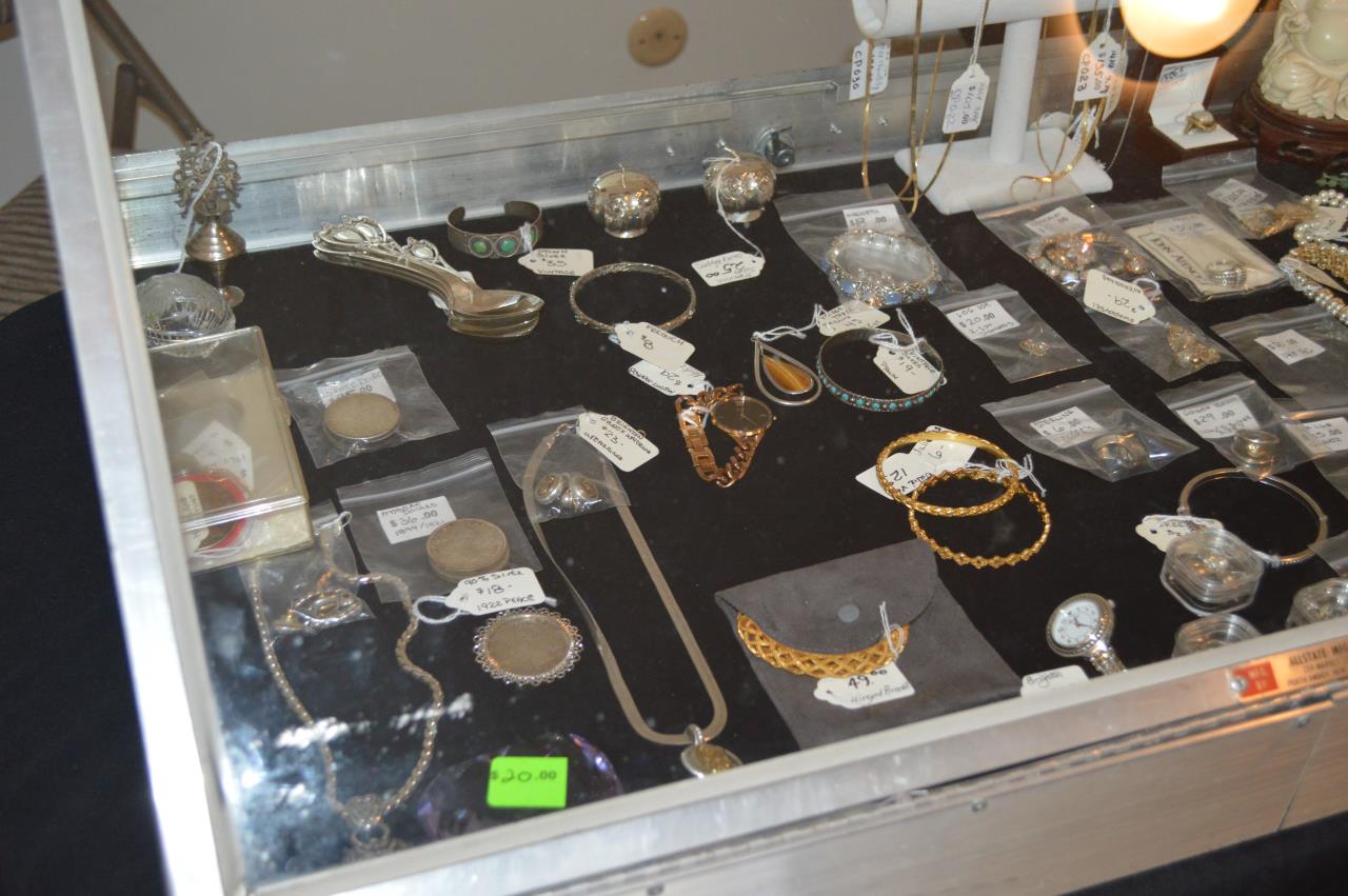 • Jewelry: 14k Chains, Charms and Ring, Sterling Spoons, Earrings, Pearls, Bracelets and Chains, Brighton Necklaces and Earrings, Costume Jewelry by Monet, Crown Trifari, Napier, and Julie Vos! Coins!