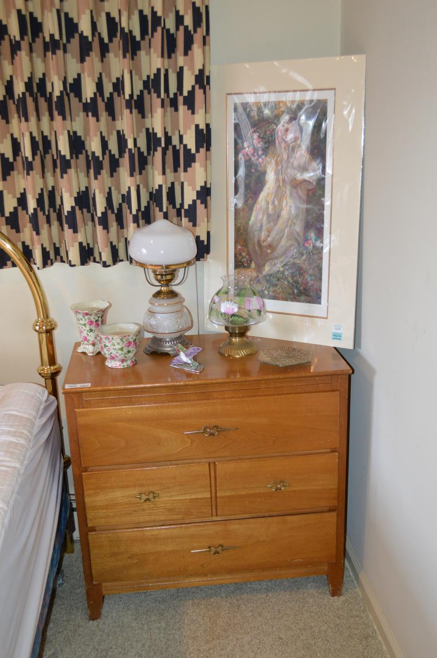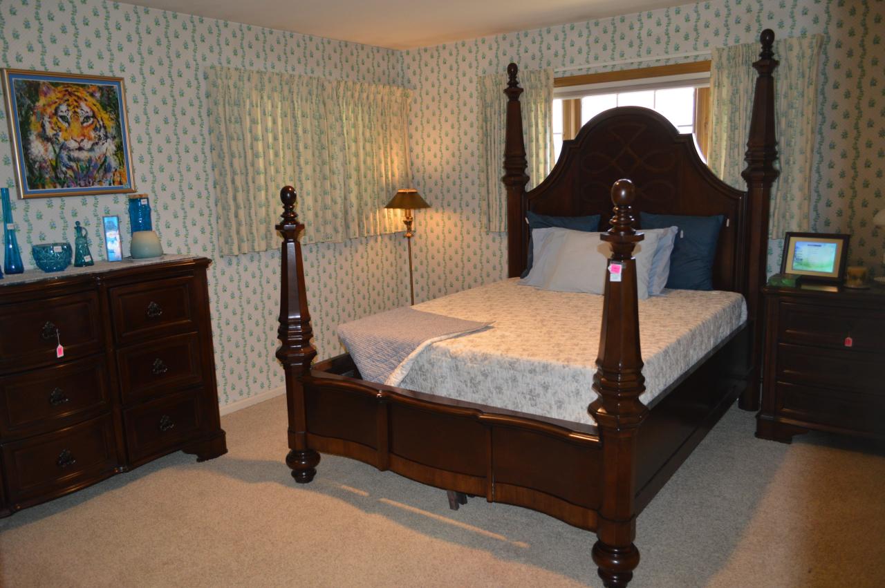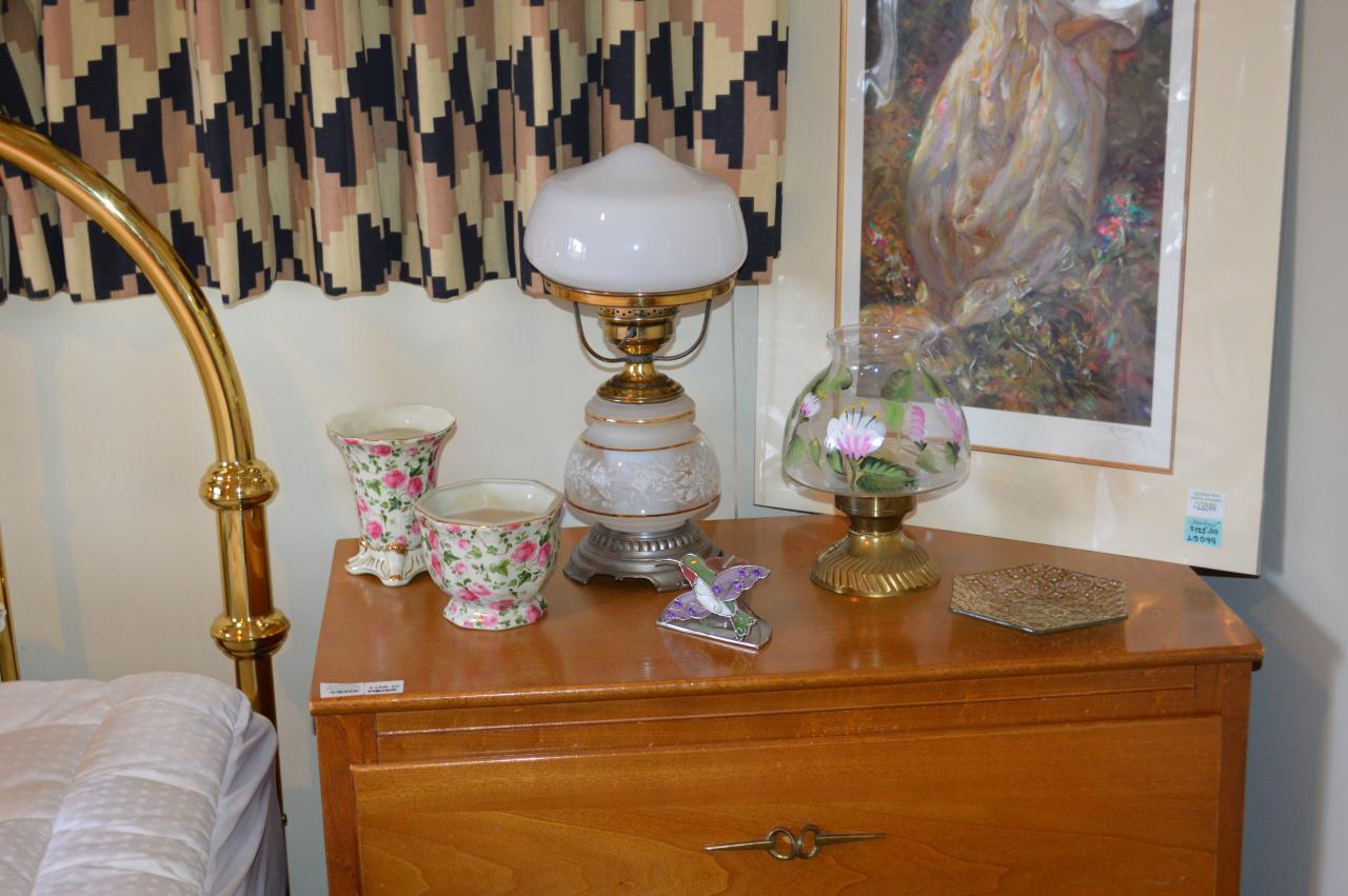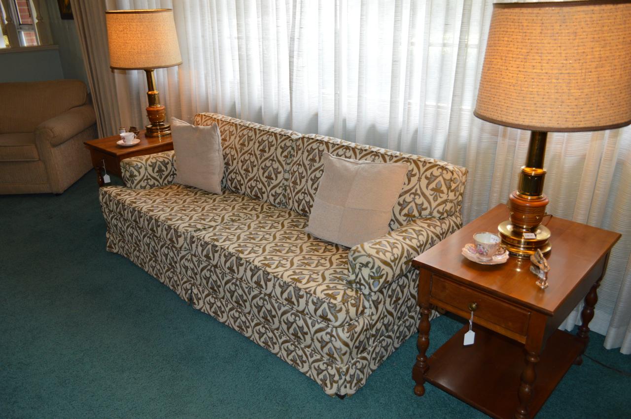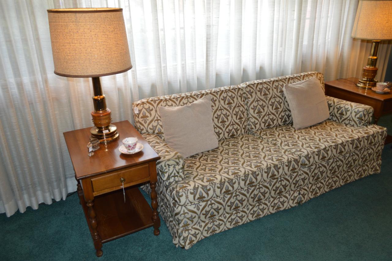 HOUSEHOLD FURNITURE And DECOR: Hitchcock Bachelor Chest, Queen Anne Table and Chairs, Adjustable Sofa/Coffee Table, Ethan Allen Chests and King Bed, Tempur-pedic Mattress, Child’s Roll-Top Desk, Wine Racks, Mexican Tile Mirror, 1950’s, ’60’s and 70’s Lamps, Brass King Headboard, Millennium Queen Bedroom Set by Ashley, Steel Case Desk and File Cabinets.